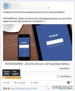 发帖互动广告对于大部分使用Facebook的营销者来说并不陌生,很多人把这作为扩散消息的途径之一,但其实这也是增强互动的广告方式之一。比如说以下发帖:如果不通过发帖互动广告,大概只有1000多的自然触及、而真正看到这则帖子的人则可能只有几百个;但如果花$20块钱做互动广告推广,得到的是4,400“曝光”,而这些曝光将带来1000多互动行动:包括点赞、分享、评论等:当人们在他们自己的“社交墙”上分享你的内容的时候,与他相关的朋友们自然也能看到你的内容:而此时你的自然触及率和互动率也将相应提高。当然,前提是你的广告受众定位精准。