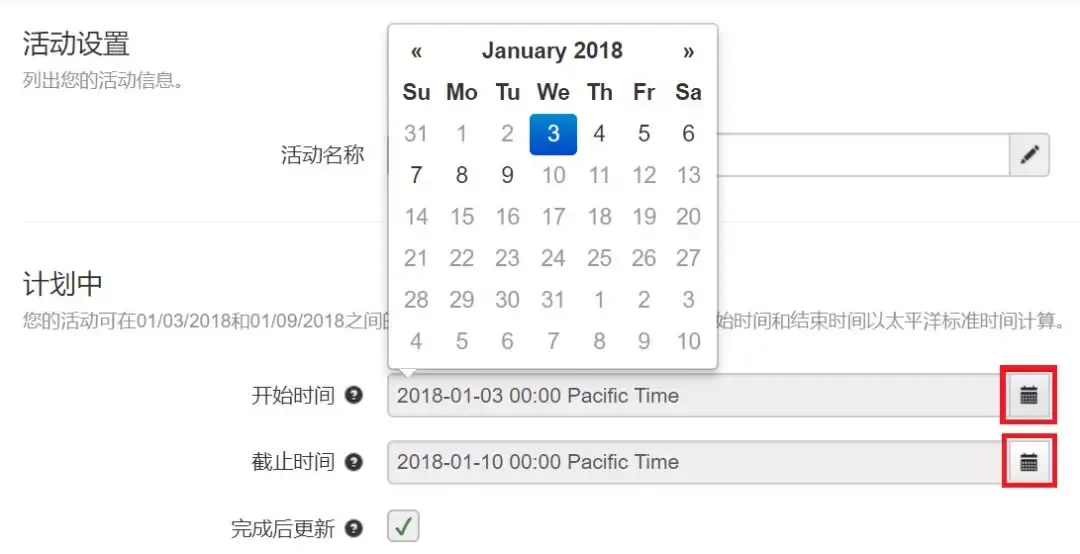 4、系统发起的“完成后更新”活动的“新设活动”期为活动发起到次日0时(美国太平洋时间),若要做活动调整,请务必把握此窗口期。