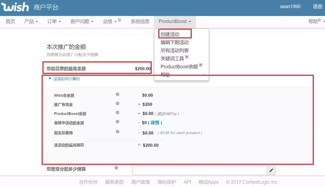 可以花费的最高金额=Wish总金额 + 推广专项金 + ProductBoost余额 - 审核中活动的金额 - 报名费用