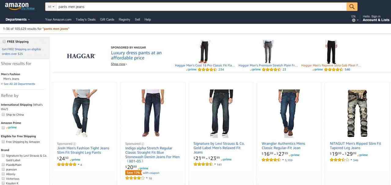 (关键词“Pants men”后加了 “jeans”属性的搜索结果)