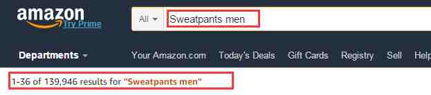 但如果买家搜索到的是“Sweatpants men(运动裤男)”时,商品搜索的结果有139946个,范围缩小了很多,而此时,你的商品被搜索的概率就会大大提高。
