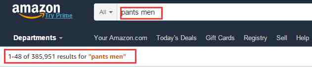 但还有一点,你需要考虑到的是,当买家搜索的关键词是“Pants men(裤子男)”时,出现的商品会是各种各样的男式裤子,西裤、休闲裤、运动裤等等,搜索结果达到385951个,范围非常广,并且标题中都含有“Pants men(裤子男)”这两个词。