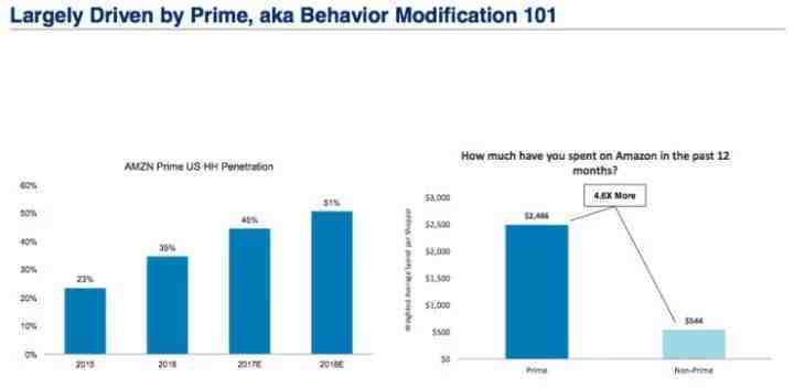 亚马逊的成功很大程度要归功他们的Prime会员机制,自2015年以来Prime会员在美国家庭的渗透程度不断递增,预估今年将达到45%,明年有望达到51%。