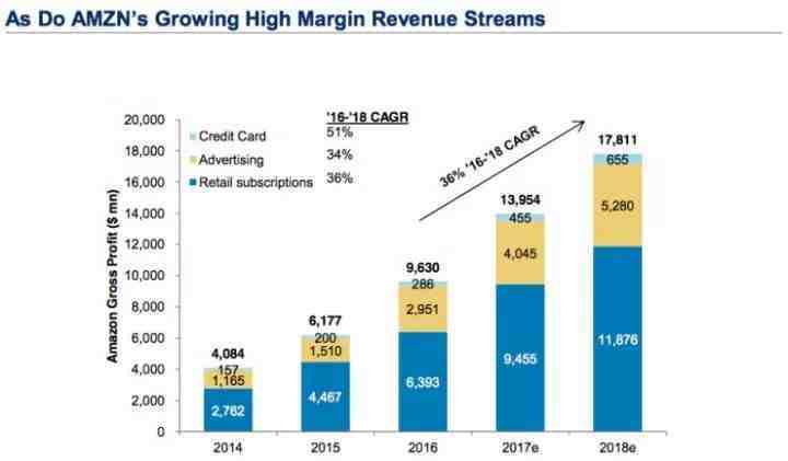 摩根士丹利数据显示,亚马逊营收的主流目前仍然是零售业务板块,该业务板块在2016年至2018年的复合年均增长率达到了36%,广告业务和信用卡业务分为34%和51%。此外,摩根士丹利预测亚马逊2017年整体业务的毛利将达139.54亿元,这一数值在2018年有望达到178.11亿美元。