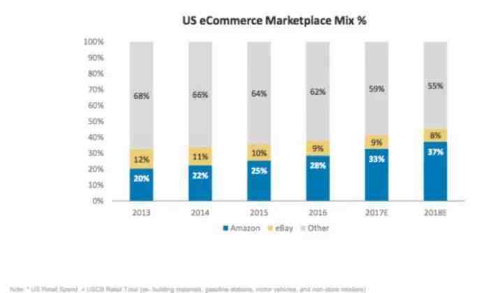 以2016年美国零售行业总体市场规模2.485万亿美元为例,亚马逊在这其中占到多少份额呢?与美国另一电商巨头Ebay逐渐下降的份额相反,亚马逊在美国总体零售市场的份额持续上涨,在2016年占比达到28%,而今年占比有望达到33%,占到2.585万亿美元的近1/3。