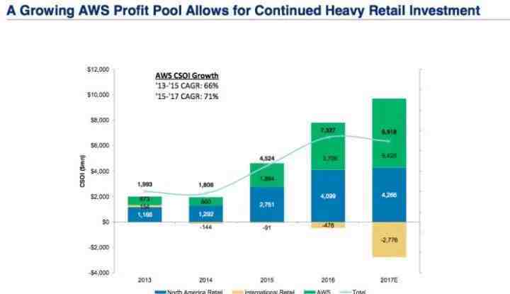 数据显示,从2013年到2015年,亚马逊AWS的复合年均增长率达到了66%,而2015年到2017年,这一数值增至71%,预估AWS的不同业务线收入在2017年可达54.28亿美元,涨势喜人。