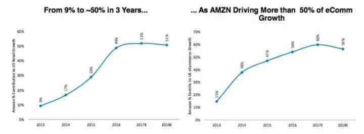然而这还不是最恐怖的。近5年来,亚马逊的存在让美国个人消费支出出现了足足50%的增长。其中,对美国零售市场的贡献,在短短3年时间内亚马逊就做到了从9%到50%的跨越,而且这数据还在一年一年的不断增长之中。