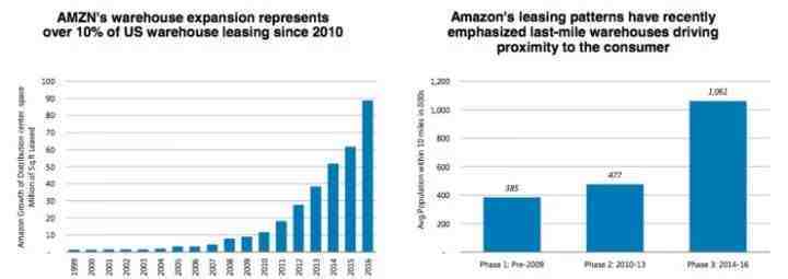 随着亚马逊Prime会员一起增长的还有库房租赁需求。自2010年以来,亚马逊的租赁面积呈现指数级增长,已占据美国仓库租赁市场的10%以上,“最后一公里库房”让亚马逊无限接近消费者。