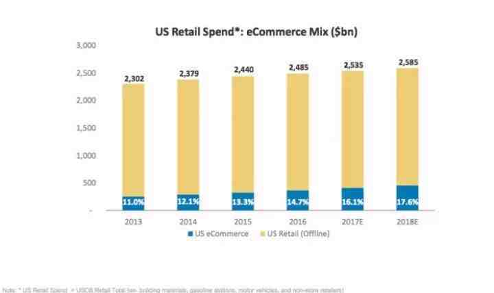 自2013年以来,美国在零售和电商领域的消费数据一直呈持续上升状态,从2013的11.0%上升到如今的16.1%,预估美国零售行业的总体市场规模在今年将达到2.535万亿美元,而明年这一数值有望攀升至2.585万亿美元。如下图: