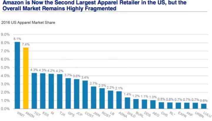 以服装而言,目前美国最大的服装零售商还是沃尔玛,占比8.1%,但与身后的亚马逊差距已经非常小,后者占全国市场的7.4%。