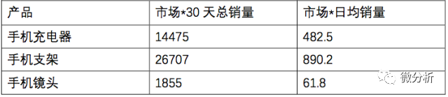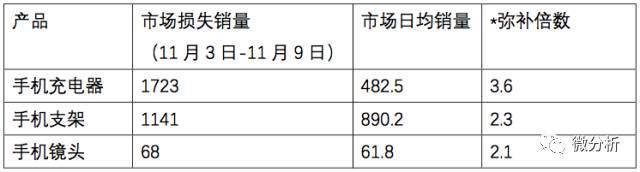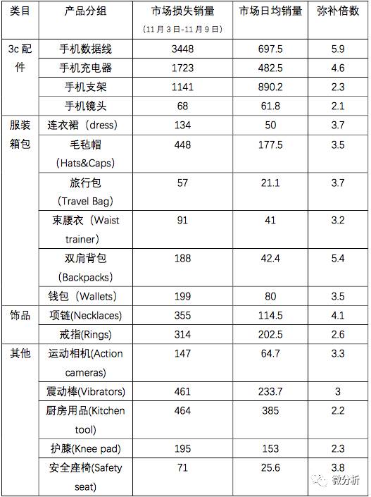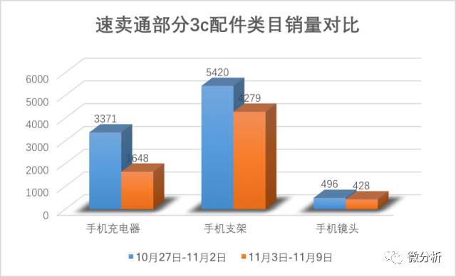 全球双十一狂欢节的一个高潮已经结束,而另一个高潮将在今天下午四点在速卖通再次被掀起,不知道各位卖家你们准备好了没? 现在距离速卖通双十一正式开始还有3个小时,微分析(WeAanaly.com)打算从别的角度来看看今年速卖通的双十一。 我们分别在11月2号和11月10号获取了速卖通部分类目卖家前一周的销量、收藏量等数据,通过对比预热期前一周(10月27日-11月2日)和预热期期间(11月3日-11月19日)之间的差异我们发现一些有趣的事情。 1 先来看一组数据 从上面两个图我们可以看出,在3c配件的部分类目中,相比预热期前一周的销量,预热期的销量明显下降了很多,手机充电器销量同比下降51.1%,手机支架销量同比下降21.1%,手机镜头销量同比下降13.7%,看来大促前期对销量有抑制作用已经是一个不争的事实。而现在的问题就在于在速卖通双十一当天,各行业的卖家究竟要获得多少销量才能弥补这个损失。 2 针对上面三个产品,我们先获取其近30天的总销量,然后计算出各自的日均销量。 *市场由该关键词在速卖通自然搜索排名前20的商品组成,全部数据均由微分析(WeAnaly.com)统计所得。 3 当我们知道了它们的日均销量和预热期损失量之后,就可以合理推测这三个行业的卖家在双十一究竟要比平时多出多少单才能弥补损失了。 *弥补倍数=(市场损失销量/市场日均销量)+1,加1是因为需要把双十一当天的原本正常的销量也纳入弥补范围。 也就是说,速卖通的手机充电器卖家在双十一当天需达到平时的4.6倍的销量,才能弥补预热期间的损失,其他产品同理。 通过这样的方式,我们就能大概估计双十一当天保底销量是多少,同时也可以把计算得出的数据当作今年双十一的及格线。大家可以在文章最后看到我们统计的更多类目的“及格线”哦。 4 但是,在我们统计过程中发现了两个特别产品 从上图可以看到,唇膏和太阳眼镜两个产品在预热期的销量反而更高,这看似反常理,但确实会存在这种情况:双十一期间,客户希望提前购买而不想经历更漫长的等待。而对于这种行业,卖家更应重视双十一开始之前的优化和推广,需要提前进行产品优化和加强客服力量。 附录 最后预祝各位卖家能够在下午的双十一大战中取得胜利! 而我们将在双十一之后做一个跟踪分析,评估一下今年速卖通双十一的表现!敬请期待!