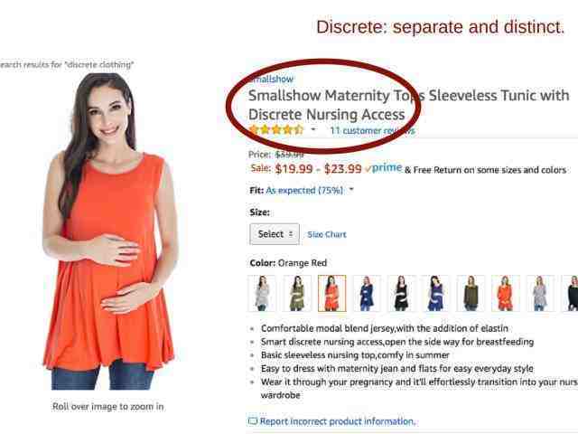 有些时候拼错单词也会闹笑话。亚马逊一个孕妇装上,情况就是如此。Discrete 意味着分离的、独立的。下面这个卖家本想使用的是discreet(隐藏,以免引起注意),看下面这个标题就觉得比较乌龙了。