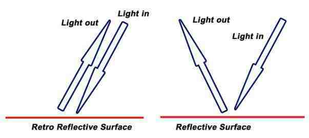夜间工作的建筑工人衣服上有一种反光带,我们通常把它称之为reflective tape(反光胶带),但实际上它是一种retro reflective tape(回射胶带)。这两个材质和原理都是不一样的,reflective tape更像是一面镜子,它反射出来的光是散向不同的方向。而回射光的方向只与原光一致。