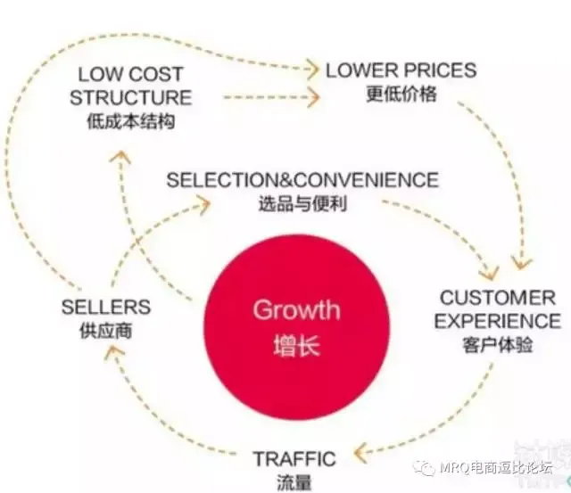 第二个维度我们先从最近很流行的亚马逊飞轮理论着手,亚马逊的飞轮理论大家应该都比较熟悉,而且网上也有很多解析(见下图),