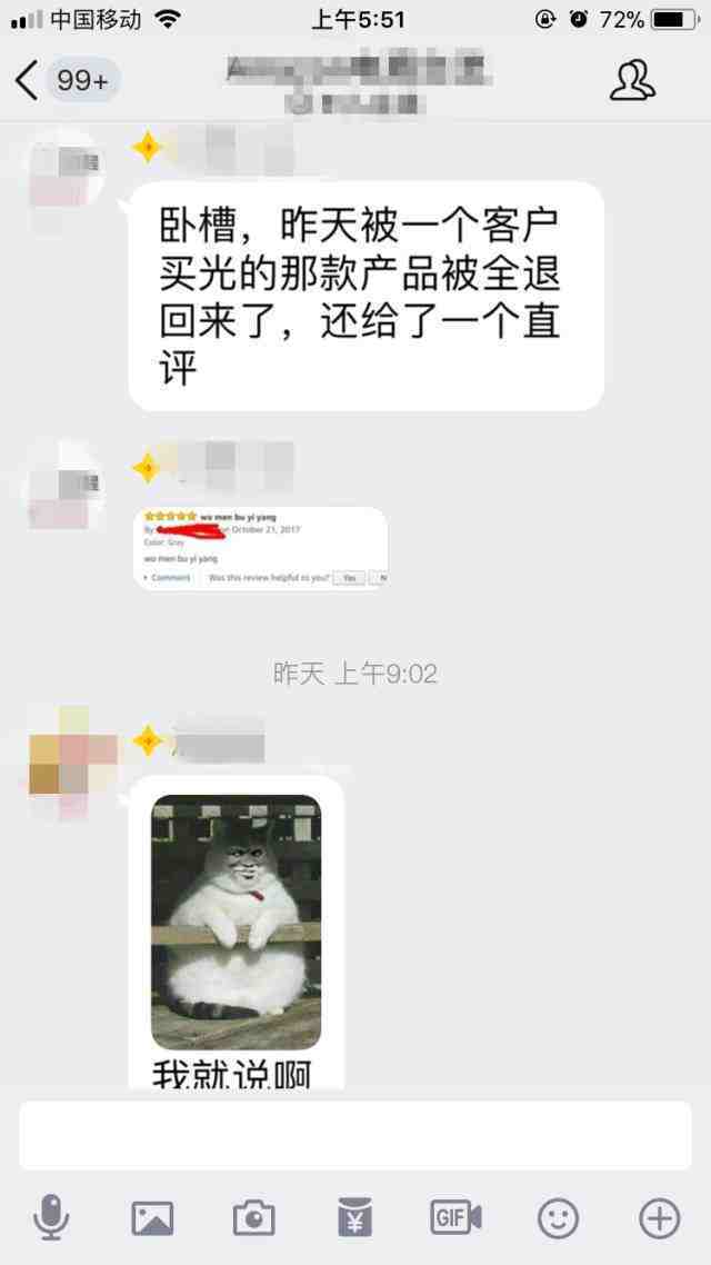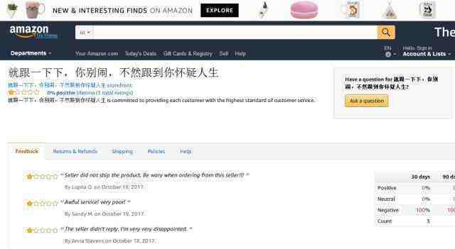 21号一位亚马逊卖家小哥库存被人买光后第二天被全部退回,同时还送给了他一个直评,直评是5星的好评,留言是:wo men bu yi yang ……