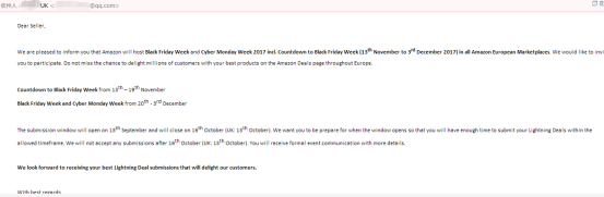 据邮件通知,开放的卖家申请时间是从9月13号截止到10月16号(英国站截止到10月13号)。