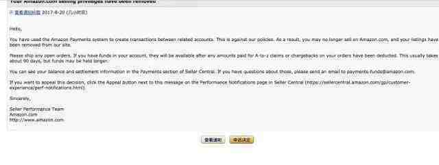 大意是:您已使用Amazon Payments系统在相关账户之间创建交易,这违反了我们的政策。因此,您可能不能继续在亚马逊上销售,您的listing已从我们的网站上删除。请发货任何未结订单,如果您的账户中有资金,那么在为A-to-Z索赔支付的金额或您的订单退款被扣除后,他们将可用……