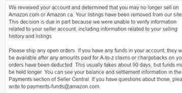 我们审查了您的帐户,并确定您可能不再在Amazon.com上销售。因为我们无法验证与您的卖家帐户相关的信息,包括与您的销售历史和列表相关的信息。如果帐户中有资金,那么在为A-to-z索赔支付金额或订单的扣款已扣除后,它们将可用,通常需要约90天。