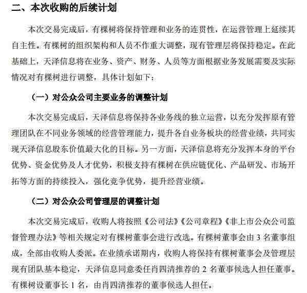 本次交易完成之后,有棵树将成为天泽信息的控股子公司,有利于获得天泽信息平台的资金支持,有效提升采购效率,实现业绩快速增长。此外,有棵树还能够借助天泽信息平台加强规范治理和管理效率,严格控制成本,实现有棵树的可持续发展。