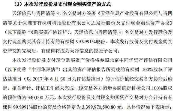 昨晚,天泽信息(300209)披露重大资产重组预案,公司拟发行股份并支付现金,作价约34亿元,收购有棵树(836586)近100%股权,同时配套融资不超13亿元。本次交易完成后,天泽信息将获得有棵树的控制权,孙伯荣将成为有棵树的实际控制人。
