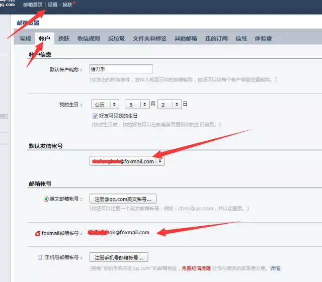 请注意上面的提示,在QQ邮箱里面点击设置之后,有一个账户标签。打开之后我们在下面就可以注册我们的foxmail的邮箱。那么这个邮箱和我们的QQ邮箱是相通的。可以共同使用。