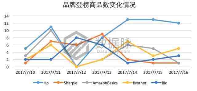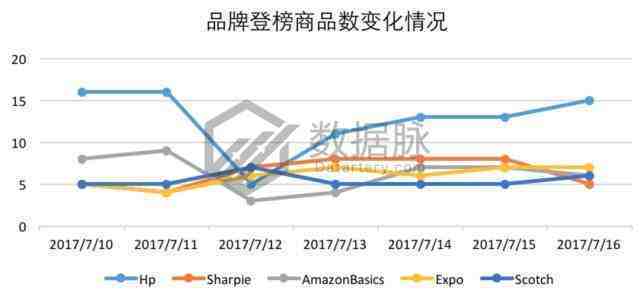 可以看到,在上周的 Best Sellers 榜单中,品牌 Hp 依旧保持着其在榜单中的较大优势。凭借在7月10日与11日每日登榜16款商品的良好表现以及后续几天的较稳定发挥,Hp 再次以一周登榜89次的成绩位居品牌综合排名首位。此外值得注意的是,上周马克笔、水彩笔类产品品牌 Sharpie 也有着稳定的登榜表现,以一周登榜45次的成绩击败了亚马逊自营品牌 AmazonBasics 等同榜竞争的其他品牌,位列品牌综合排名第二。骆探长(shujumai.com)注意到,同样主营水彩笔类产品的品牌 Expo 在上周也已42次的总登榜次数位列品牌综合排名第四,可见水彩笔、马克笔系列产品是近期榜单关注的重点之一,建议相关卖家着重跟进考察。
