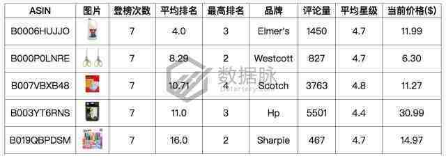 可以看到,在上周 Office Products 品类的 Best Seller 榜单中,一款品牌为 Elmer's 的手工用液体胶在一周中排名稳定,于2017年12日开始连续5天跻身榜单前五,以平均排名4.00的成绩位列综合排名首位。