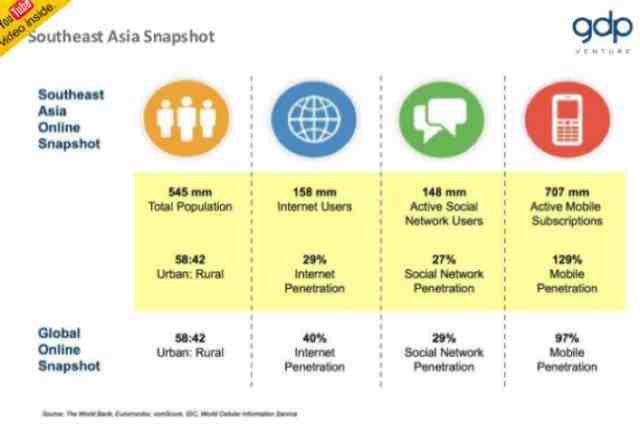 基于东南亚总人数为5.45亿的市场,Slideshare统计东南亚互联网用户达1.58亿。网络渗透率为29%,社交媒体活跃用户达1.58亿。
