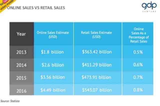 但是印尼电商规模增速并不快,2016年线上网购收入达44.9亿美元,占零售0.8%。2013年电商占总零售的0.5%。