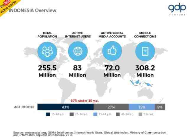 印尼总人口为2.555亿,互联网用户为8300万,社交媒体活跃用户达7200万。在所有互联网用户中,年龄在35岁以下的用户占67%,其中有43%的15—24岁用户,以及27%的25—34岁用户。到2020年,印尼互联网渗透率将达63%。