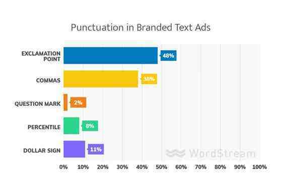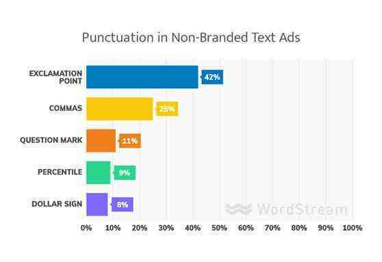有趣的是,非品牌广告文案中货币符号的使用率比品牌广告低约3%。非品牌广告中各标点符号的使用率如下: