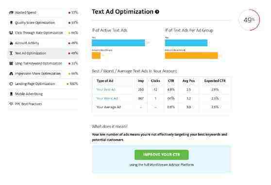 WordStream用免费的AdWordsPerformance Grader检查每一个账号,得出报告并决定该账号最佳的广告(同时还有最差的广告),如下图所示:
