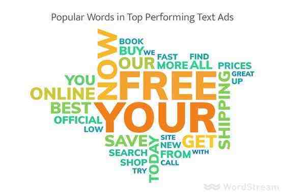 为了找出合适的广告关键词,WordStream研究了一些表现好的广告文本,并将这些文本拆分成单独的词,剔除连词(and、or)、冠词(a、the),最终找出了10个最受欢迎的词:
