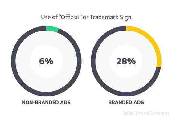 为了打败竞争对手,传达真实性很重要,最简单的方法之一就是使用商标标志(TM)或用其他方式传达官方性质。过去,研究甚至发现在广告中使用标志可能会提高转化率。有趣的是,表现好的广告中,只有28%的品牌广告和6%的非品牌广告会这么做。