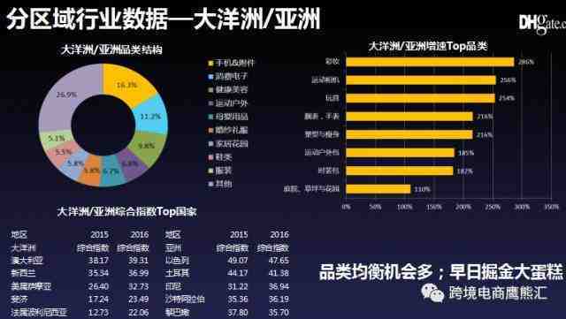 大洋洲/亚洲市场品类结构的占比,最典型的国家是澳大利亚、印尼和以色列等等,像玩具增速都超过200%,时尚类的产品,时装包等等增速都超过100%。这个市场的特点是品类均衡、机会多、体量大。