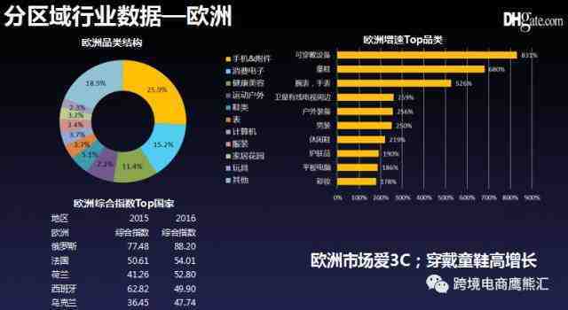 欧洲市场在跨境电商交易中仍然占有非常重要的地位,去年很多国家的增速都超过50%。从交易规模来讲,欧洲也是最大的市场。欧洲市场的特点是市场规模比较大,互联网的渗透率和普及率都非常的高,很多的小语种国家增速都超过100%。随着一系列跨境电商面临的挑战被突破,欧洲也会有更多的国家愿意从中国购买丰富多样、物美价廉的产品。欧洲市场的北部相对比较成熟,南部增速非常快,东部主要是新兴市场,三个市场都有不同特点,需要针对三个市场做有针对性的产品和服务,才能比较好的去适应欧洲市场。欧洲市场总的来看目前还是以3C为主,手机附件和消费电子占了接近40%的市场份额。在细分领域里面童鞋增速非常显著,超过500%。
