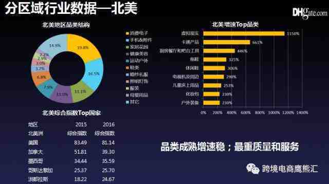 北美市场,跨境电商在北美市场已经取得了非常长足的发展。北美市场的市场规模大,增速平稳,主要以消费电子、手机、家居为主,一些高科技产品受到追捧,虚拟现实产品增速超过10倍,卡通产品也得到非常高速的增长。北美市场是成熟市场,虽然这几年被新兴市场抢了不少风头,但是依然是跨境电商的交易重地,在很多领域都蕴藏着无限商机,要运营好这个市场主要要做好质量和服务。