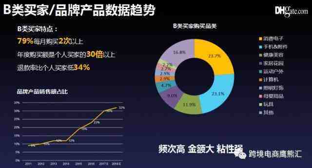 B类买家特点,79%每月买卖2次以上,年度购买额是个人卖家的30倍以上,退款率比个人卖家低34%。在整体的市场规模当中,B类买家贡献了70%以上。但是频次高、金额大、粘性强,无形之中大大地增加卖家的经营成本。为了给买家提供有质量的产品,我们要塑造中国品牌,去年品牌占比得到迅速提升,我们预测这个趋势在未来几年还会持续。