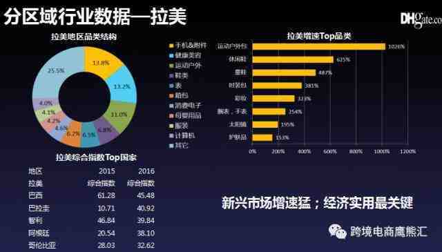 拉美市场和北美市场有很大的不同,像运动户外包增速最为显著,其次是一些服装配饰类和儿童产品也显示了巨大的需求量。拉美市场正在逐渐兴起,随着人口红利带来的潜在消费群体的增加,社交媒体的广泛应用以及互联网普及率的提升,拉美市场正在逐渐地被看好。当前拉美市场的电商销售额占零售额的比例还不足5%,也说明这是一个非常有潜力的市场。去年拉美有6个国家的增速全部都超过了市场的平均增速。拉美市场人口结构年轻化,追求时尚、经济、性价比高,像运动、服饰、美容类产品都有巨大的空间。