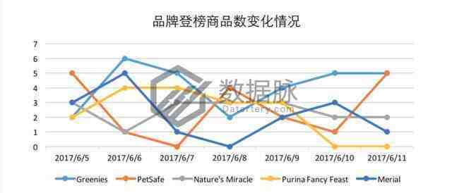 可以看到,在上周Pet Supplies品类的Movers & Shakers榜单中,Greenies 再次展现出其品类霸主的地位,凭借在6月6日、6月7日、6月10日、6月11日中单日登榜商品5款以上的良好表现,再次以总登榜次数29次、登榜商品数16款的成绩碾压其他品牌,位列品牌综合排名首位。同时,清洁剂品牌 Nature's Miracle 在上周也有不错的榜单发挥,以登榜商品数12款、总登榜次数17次的成绩位列品牌综合排名第三。此外骆探长(shujumai.com)发现,同样与宠物食品相关的另一个 品牌 Purina Fancy Feast 在上周的前半段也有不错的登榜表现,可惜后劲不足,于6月10日、6月11日淡出榜单,最终以总登榜次数16次的成绩屈居品怕综合排名第四。