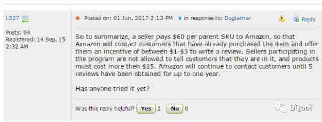 热心卖家帮忙总结重点,一个父体 SKU 费用 60美金,亚马逊会联系已经购买商品的买家邀请留评,时效一年最多索取到 5个 Review 为止。