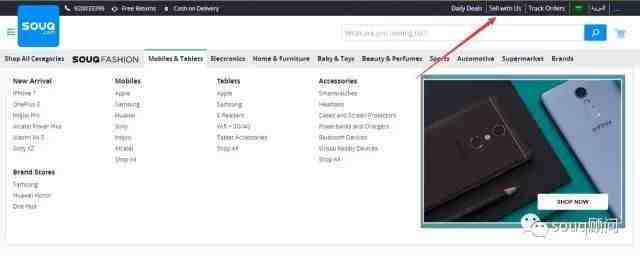 接下来我们要登录我们的卖家账号后台,我们可以通过网址www.souq.com点击网页右上角 “Sell with Us”(图2),也可以直接输入网址sell.souq.com,进入我们的卖家后台。