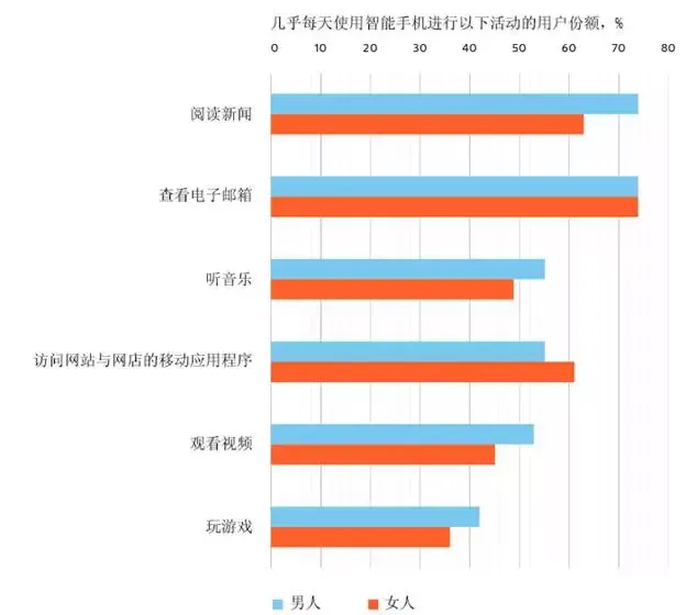 据统计数据显示,人们更经常使用智能手机订购平时购买的商品。例如,女人比男人更经常在网上购买服装与化妆品。与男人相比,女人就更经常使用智能手机购买这些商品。而男人更倾向于使用智能手机购买电子商品与汽车配件。