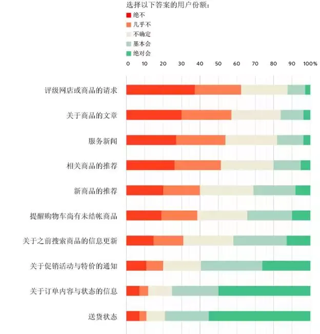 推送通知的内容影响到消费者对其的态度。对于订单状态或送货的信息用户采取积极态度。最不容忍的是评价网店的请求。27%的受访者表示,这样的推送通知让他们烦恼。