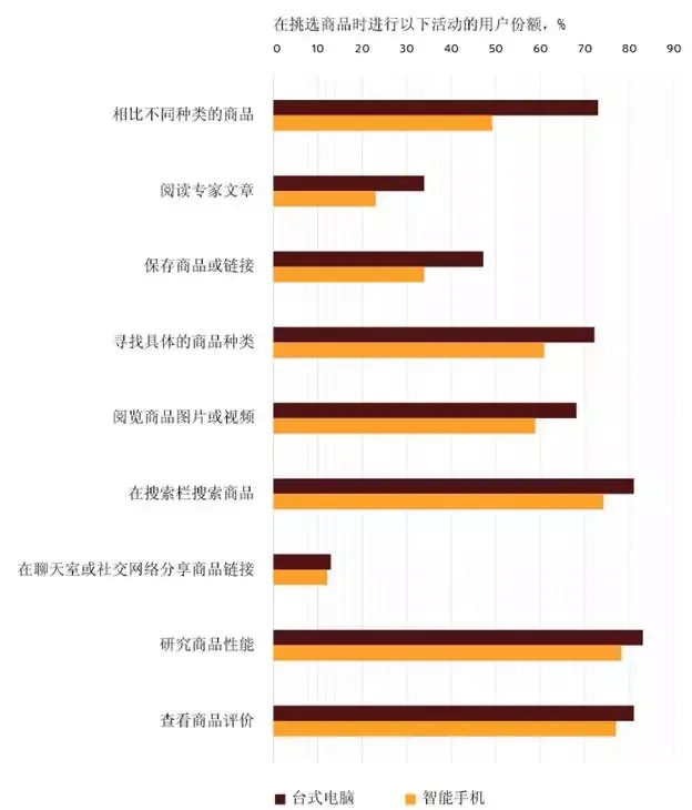 在挑选商品时,用户同样使用台式电脑、笔记本与智能手机。不过,需要更加仔细的挑选与相比几种商品时,用户更经常使用台式电脑。