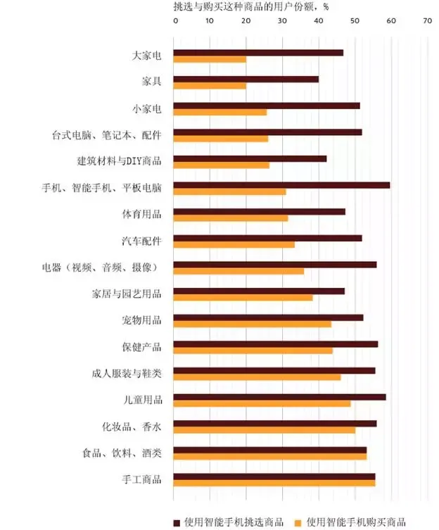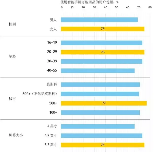 人们更倾向于使用智能手机挑选商品,而不是订购商品。商品价格越高,用户使用智能手机购买商品的可能性越低。与此同时,在最贵重商品板块的通过智能手机订购商品的用户份额已高达20%。