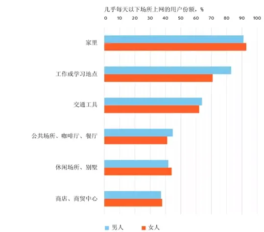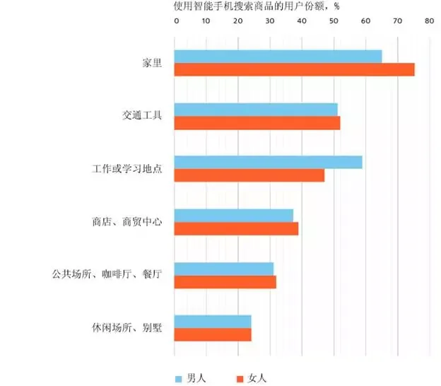 俄罗斯网上消费者使用智能手机在家里与其它地方挑选产品,其中70%的受访者表示在家里的时候曾用过手机搜索商品,83%的受访者表示在户外其它地方用过手机搜索商品。