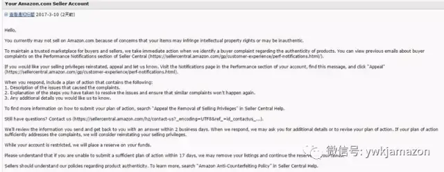 如果收到这封邮件,意指商品侵权或有客户投诉,这是美国站针对上线90天以内的新卖家的,销售品类包含服装、鞋子、玩具、运动四个品类,一旦出单,就会触发系统 auto suspend,理由是 high risk,卖家按照亚马逊提供的邮件要求来进行申诉,有可能会被要求提供进货发票,这时只需要提供相关产品的增值税普通发票,就可以通过审核,恢复销售权限。