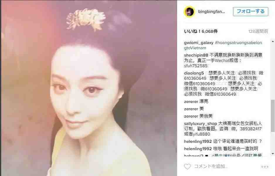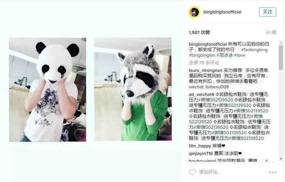 下图是范冰冰在instagram上发表的一张图片,评论区域,几乎被各种微商广告沦陷,如图所示: