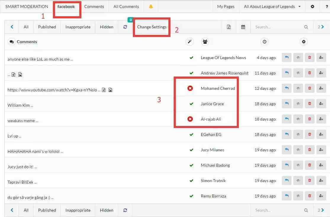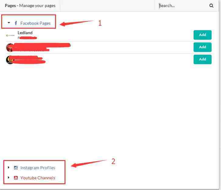 如上面所说,这个工具可以去除Facebook,instagram和YouTube上的垃圾评论,所以如果你想去除Facebook专页上的垃圾评论,你可以选择1 部分(红色箭头),系统会自动的列出来你所有的页面,这个时候你可以点击右边的 “Add”按钮,表示你想移动的是该页面上的 垃圾评论。